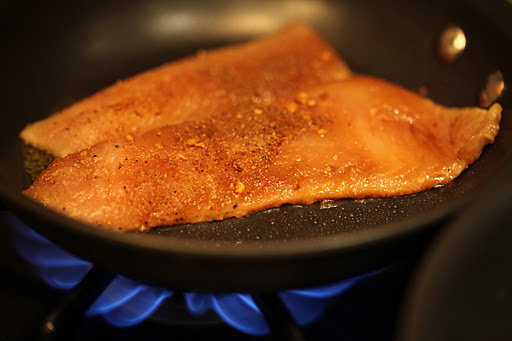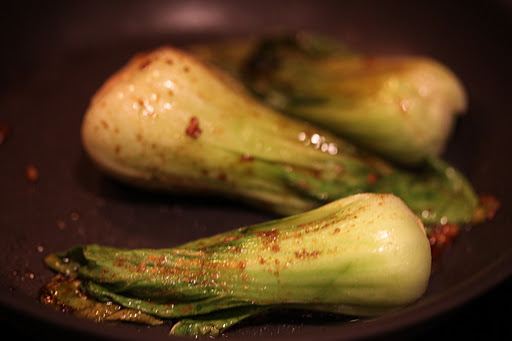 As the fish was cooking nicely, I turned down the heat and turned on the heat for the bok choy. I covered the pan and let it cook for about 3-4 minutes before turning each piece over and letting it sit for another couple minutes.