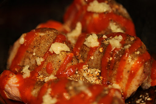 I added a touch more of the seasoning, sriracha, soy sauce, and honey to the new top side of the drumsticks just to give it a bit more evenness in the coating.