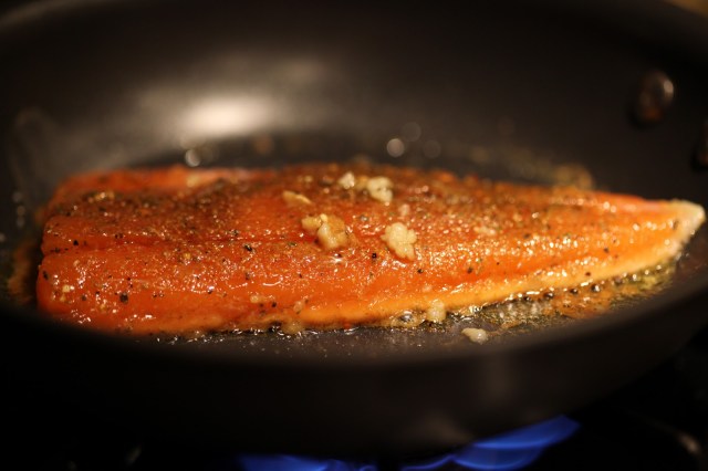 Now that I live in Vancouver, in addition to regular salmon, I have the option of arctic char which is a salmon variety that is from the arctic waters. Looks about the same but perhaps a bit more muted orange than saturated red. I marinated it in a bag for a couple hours with some teriyaki sauce and various spices including coriander, cumin, Thai spice mix, Cavenders, and garlic salt. I cooked it in a pan with a little olive oil and minced garlic.