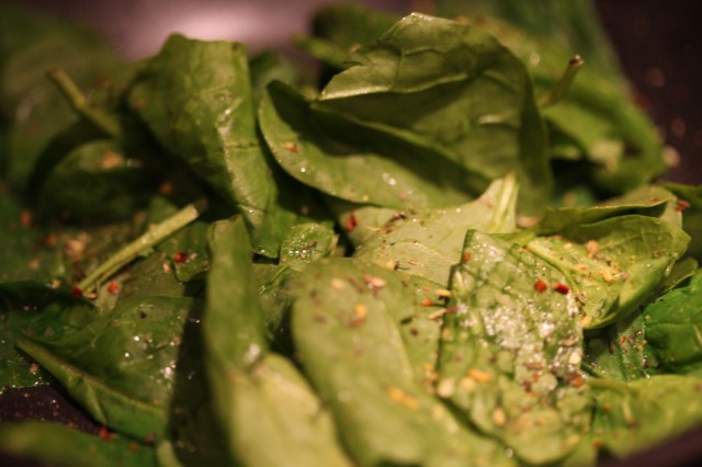 Then I heated up my veggie mix from last night — brussel sprouts, carrots, peppers, and potatoes. After that, I cooked up some spinach just enough to get it wilted. I put just a touch of vegetable seasoning on the spinach as it was cooking and let it steam under a cover. I prefer the spinach in a bag over the organic bunches of spinach that I spend way too much money on and spend way too much time cleaning and end up wasting way too much of that’s not edible.