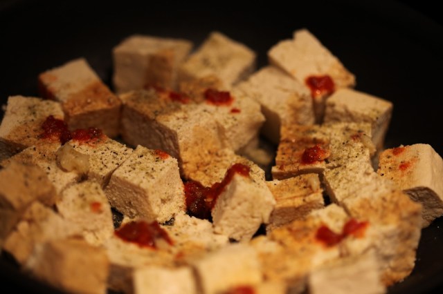 Once dried out sufficiently, cut into cubes and add to a frying pan. Top with all the ingredients above except for ginger. (Although, you could add the ginger — I just put a lot in the vegetables already.) As the tofu is cooking, turn the cubes and press them gently to help brown the edges a bit.