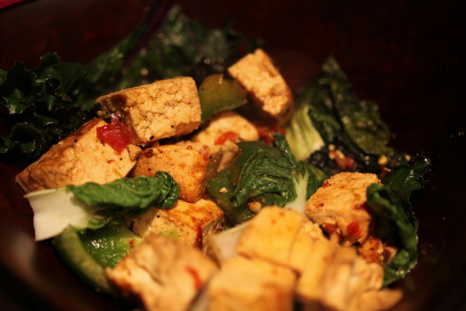 The holidays are coming up and I have to empty out my fridge before I head back to DC for 12 days. Why, oh why, did I get groceries last weekend? I was thinking today about what I might do to use up some of the remaining produce including kale and baby bok choy, and I decided as well that I need to cook up the tofu I bought.