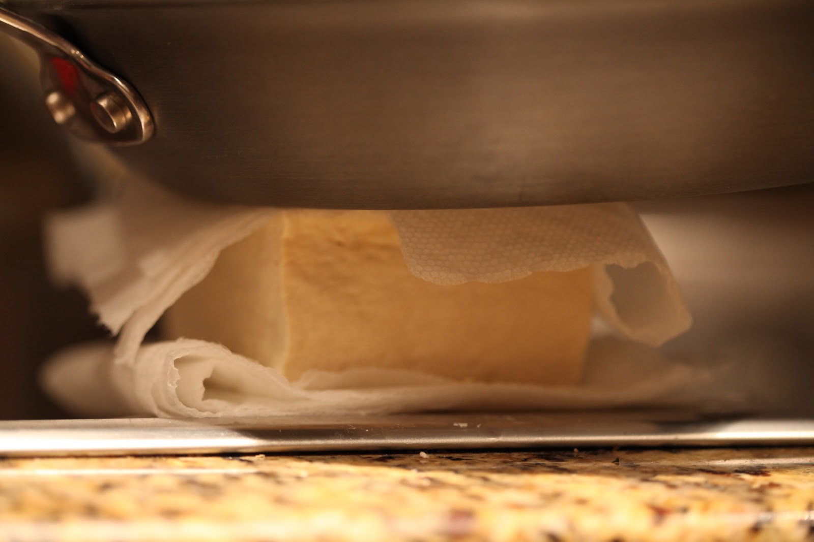 First step, press medium or firm tofu between thickly folded paper towels with something heavy on top. I opted for a frying pan. Press for about ten minutes and actively squeeze down a bit to drain the excess water.