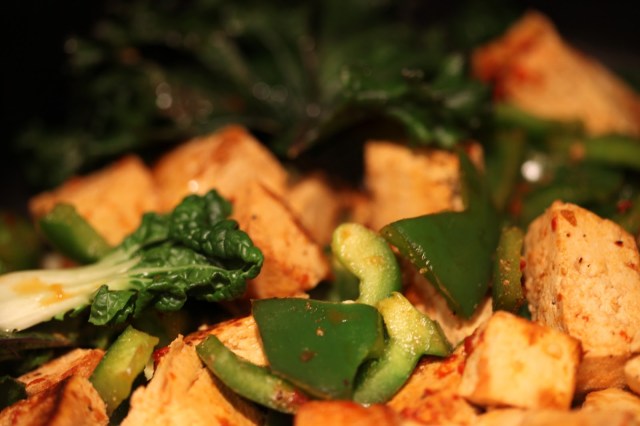 I can tell you it’s not my favorite meal, but it was good. I might try to make it again with different vegetables. The kale is a strong and bitter flavor, and it just didn’t feel like the right ingredient. Still, it was healthy, fast, and filling. Plus I got to use up some fridge items before my trip, so that’s always a bonus. When I heated up leftovers the next day to make a spicy tofu wrap, I nixed the kale and wilted some romaine lettuce instead. That complemented the tofu much better, and was much easier to eat within the wrap as well.