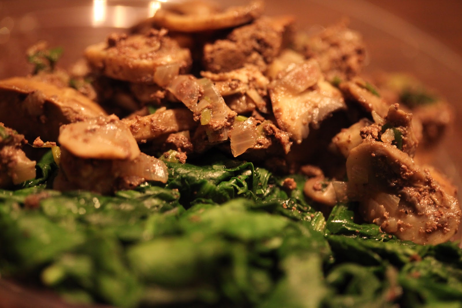 A few weeks ago, I was at Whole Foods and they have these frozen cups of chicken liver that I excitedly purchased. They stay good in your freezer for a few months. I stopped at the local produce market near my apartment and picked up some fresh mushrooms, a red onion, spring onions, and some fresh spinach.
