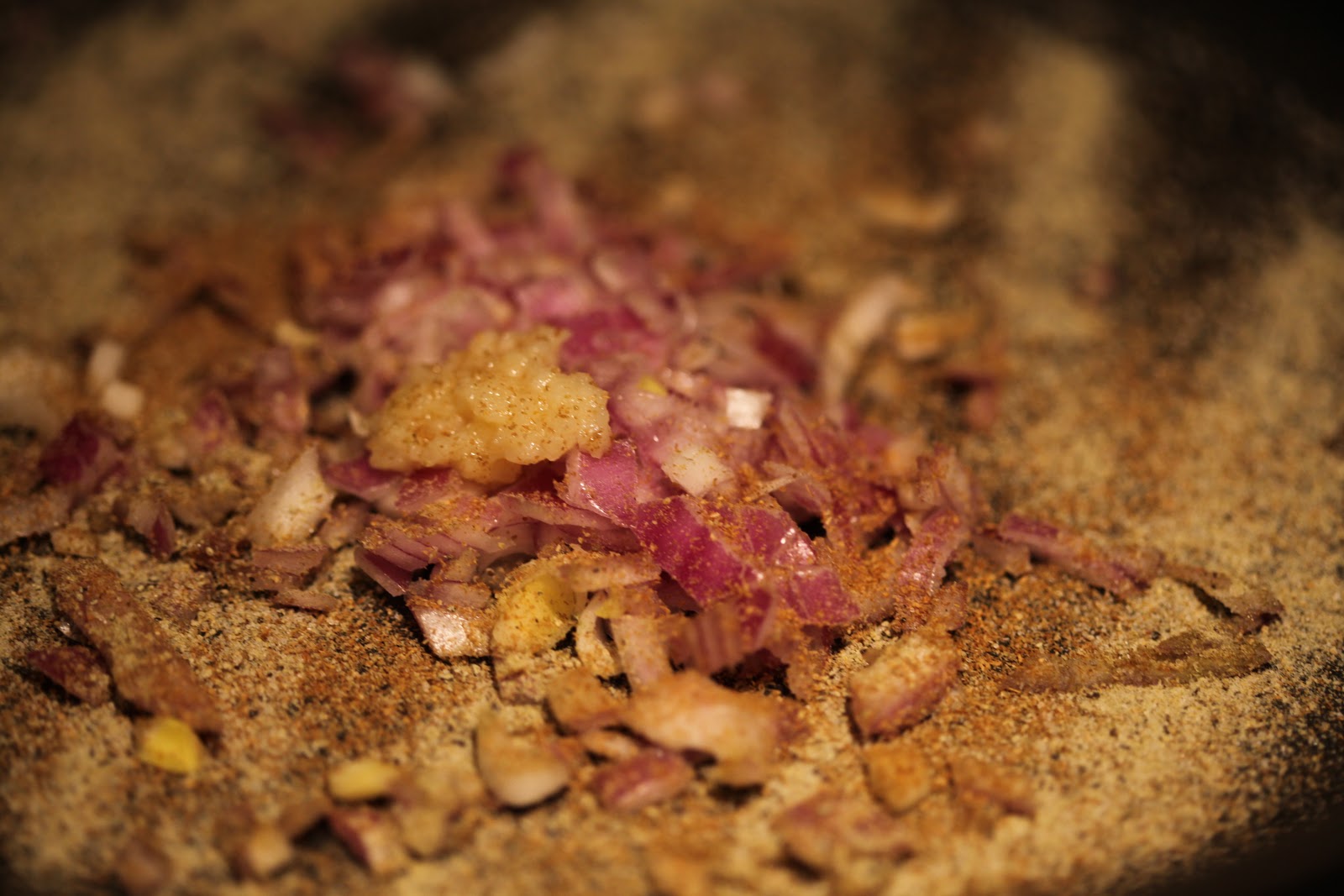 I sauteed chopped red onion with some garlic and spices. If you’ve been following me, you won’t be surprised that I used Cavenders, cumin, coriander, garlic salt, and salt. I added some spring onions to the mixture just before adding the chicken liver.