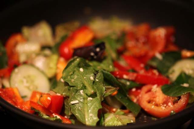 Once the peppers were starting to soften around the edges, I added the salad and turned down the heat. The goal was to get everything to an even temperature and stir up all the flavors but not really cook the salad.