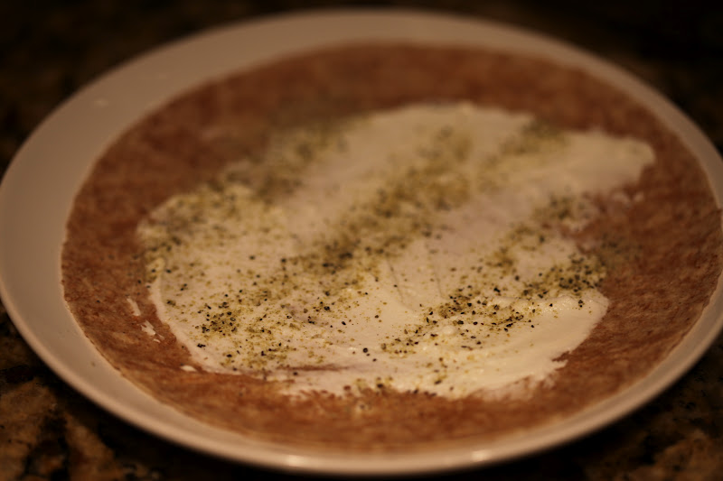 In the meantime, I toasted some whole wheat whole grain wraps. Those were coated with a little bit of Greek yogurt and sprinkled with Cavenders seasoning.