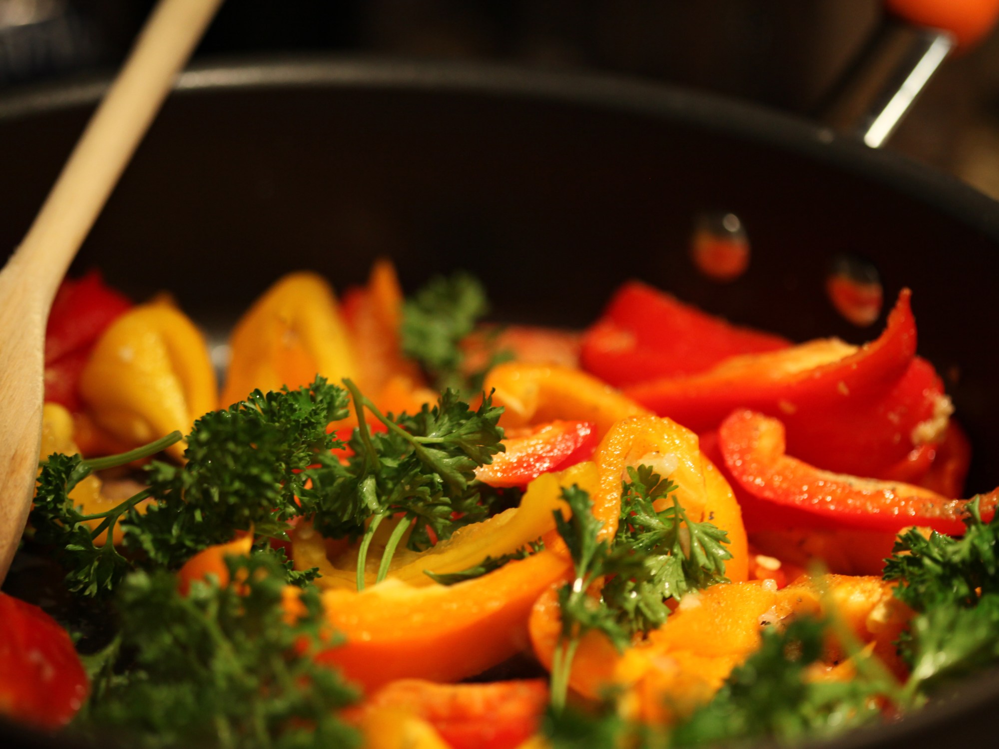 I sliced up my red, yellow, and orange bell peppers and tossed them in the pan with some chopped red onion to saute. I seasoned the mixture with garlic, salt, Cavenders, and some coriander. Once the peppers were cooked through, I added some fresh italian parsley to contrast not only in color but in flavor as well. Parsley has a very subtle bitter quality to complement the sweetness of the peppers.