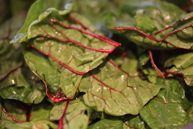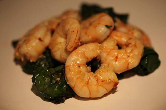 Tonight I wanted a very simple dinner. Swiss Chard and Shrimp. I love beautiful leafy Swiss Chard with its bright red stems and veins. I thought about topping the shrimp and Swiss Chard over a nice creamy polenta or some grits, but decided to keep it simple and carb free for the evening. I did just get back from vacation, after all, and I was already drinking my carbs for the evening.