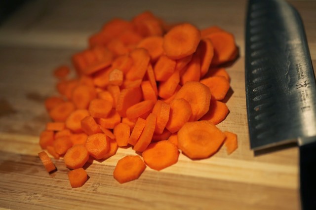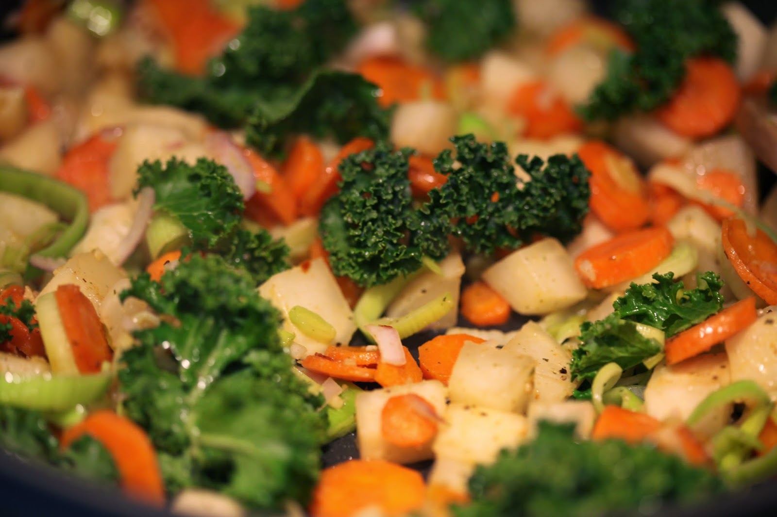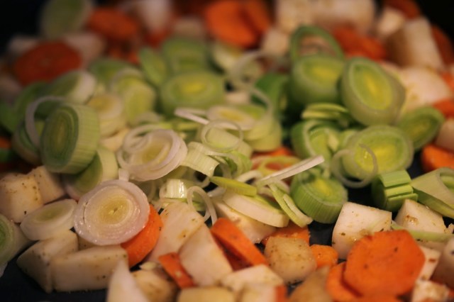 Saute the carrots, leeks, and turnips with olive oil and ground ginger, salt, and garlic.