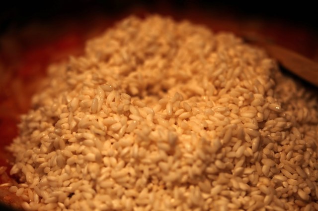 In the same pan, on top of the base sauce, I added the rice. For my paella, I chose to use risotto rice (arborio) instead of paella rice (bomba). This was purely because I had it on hand and I like my paella rice a little more moist than dry. I found a great tip online that says to use 2 cups of broth per cup of arborio rice, and 3 cups of broth per cup of bomba rice.