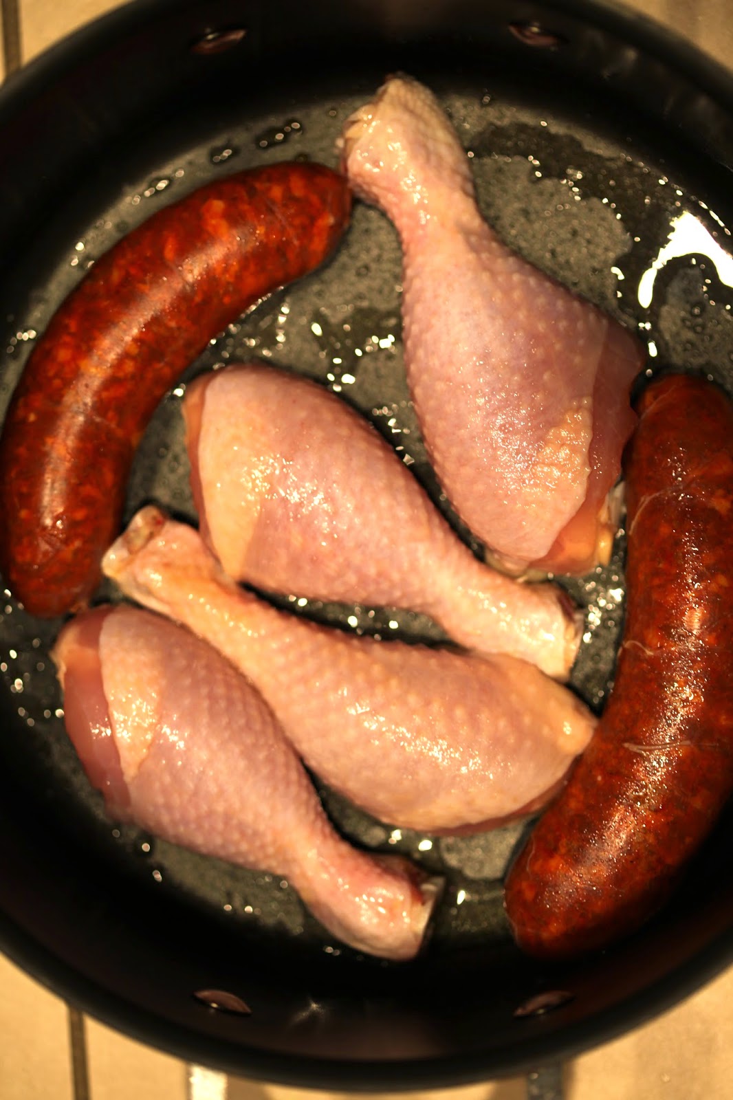 Nestle the chicken and chorizo onto the rice, and cover the pan. Continue cooking on medium-low heat for about 45 minutes. During this time, be careful not to stir the rice much.