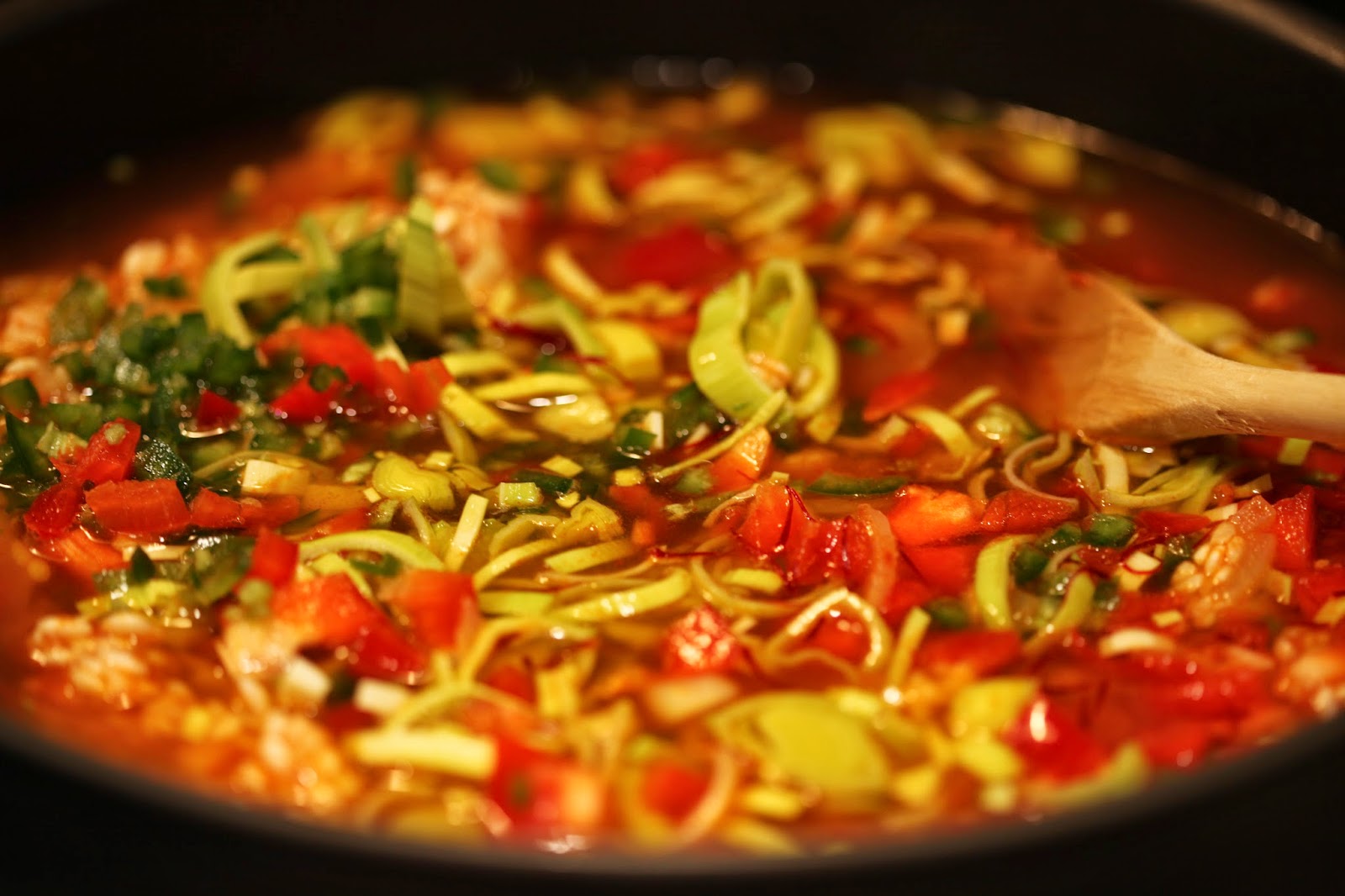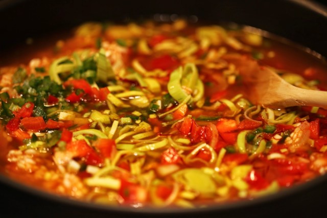 Whichever rice you go with, stir it into the sauce for a few minutes until the rice starts to develop a little translucency. At this point, you add in your saffron-infused broth that’s been sitting for about 20-30 minutes. Cover the pan and let it cook for a few minutes so the rice is settling nicely into the broth and sauce and absorbing all the liquids. At this point, you can add in some of the other vegetables — leeks, spring onions, red peppers. Also any seasoning you want in the dish should be added here — pimenton, salt, pepper, garlic.