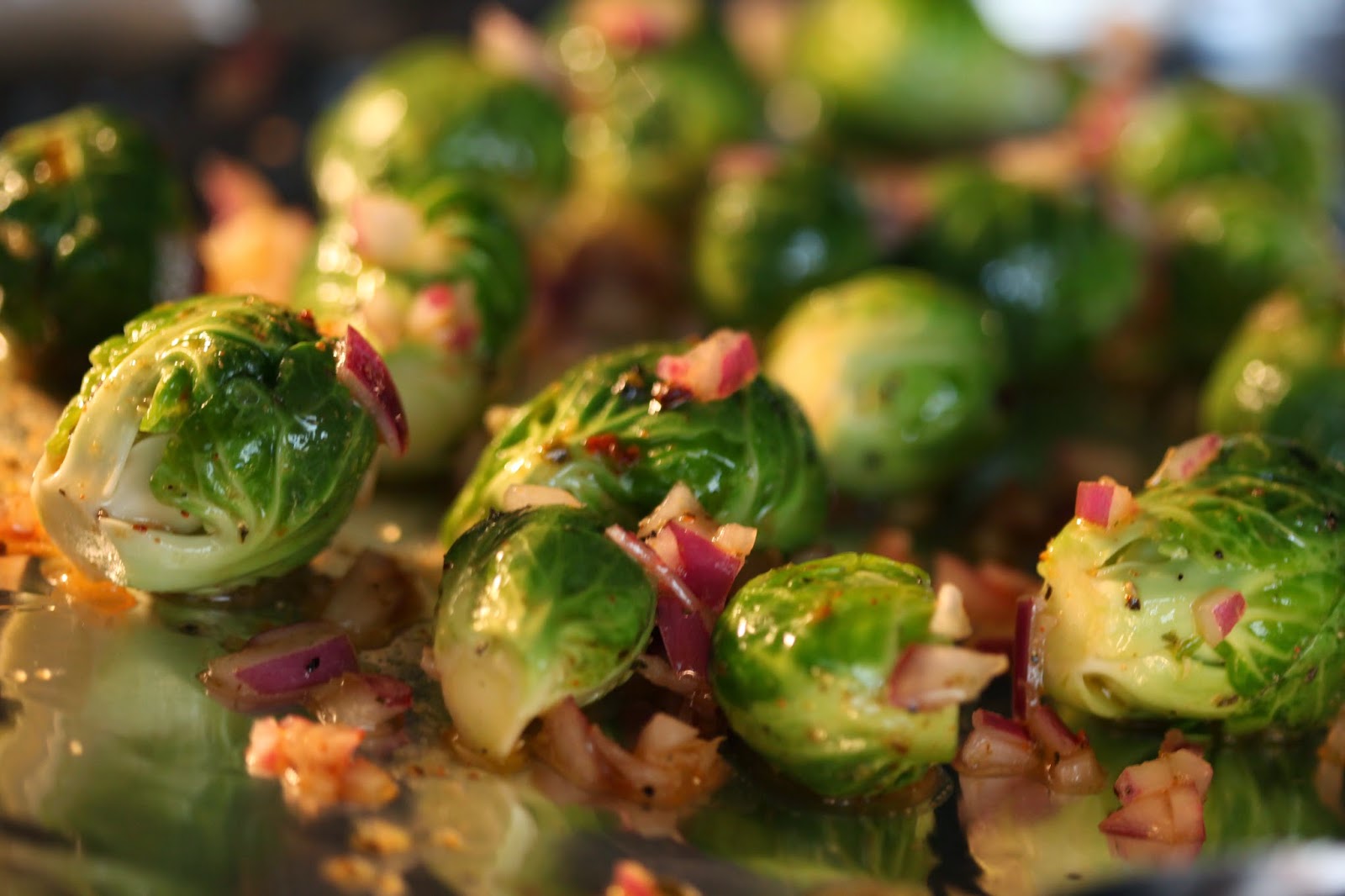 Brussel sprouts can be steamed, sauteed, baked, grilled, roasted. In this case, I had a good bunch of them that needed to get cooked and I decided to roast them. I had 1 tablespoon of chopped red onion left over from other things I was cooking, so I thought I’d add it to the brussel sprouts also.