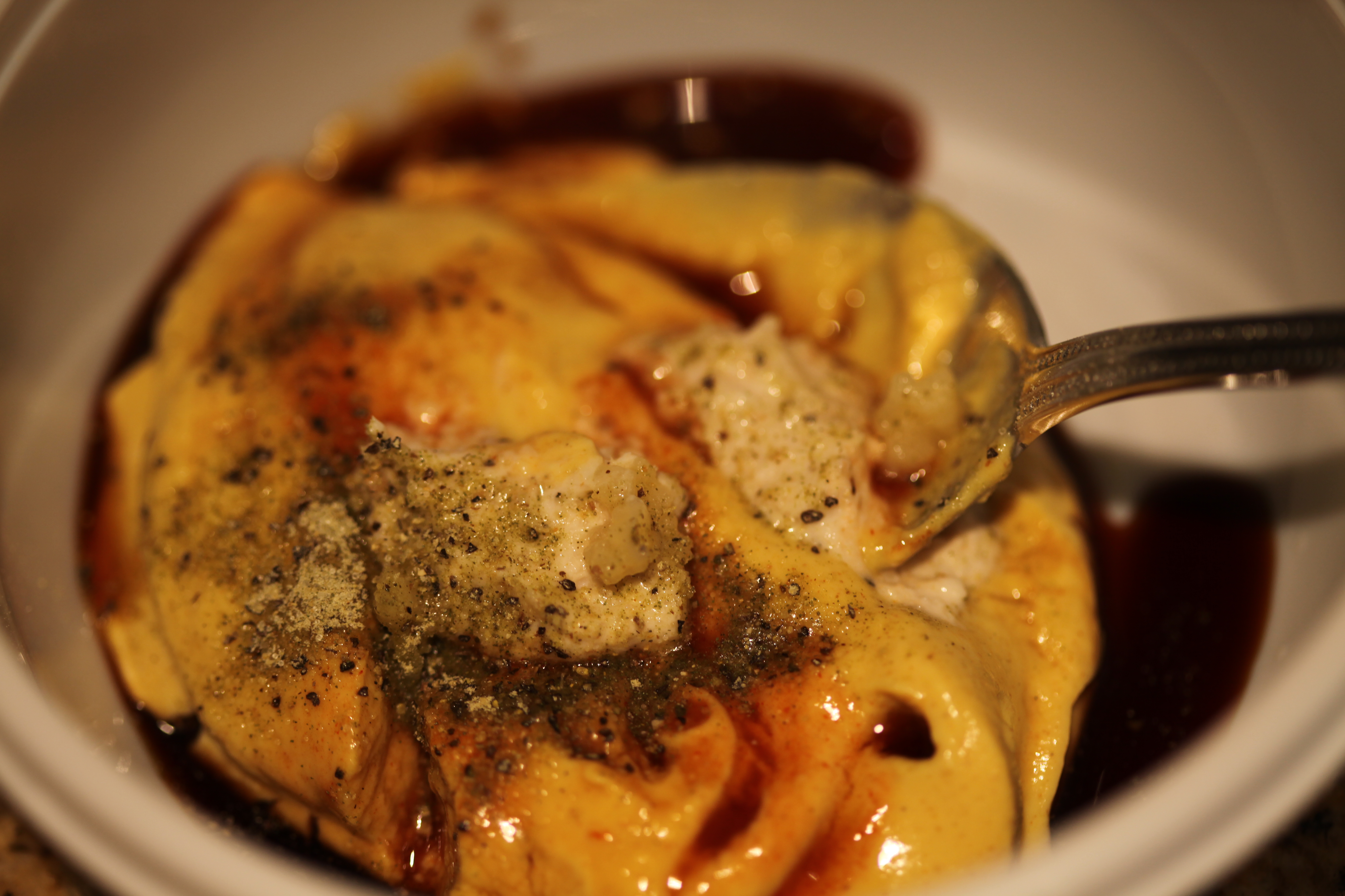 It may not be conventional, but it is really tasty. I use about three parts mayo to 1 part mustard, and just a dash of the soy sauce to not overwhelm the sauce with saltiness. Mix well until you have a smooth creamy consistency.