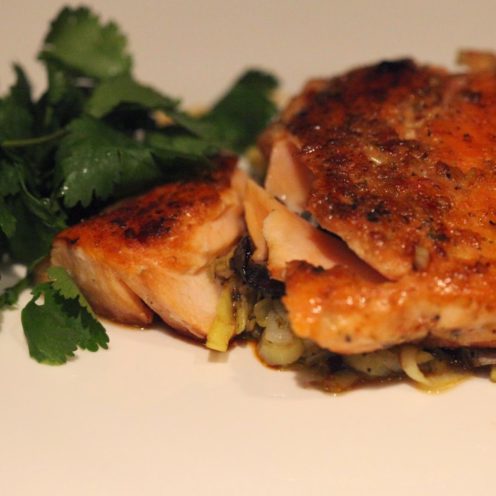 Honey Marinated Arctic Char with Leeks and Cilantro.