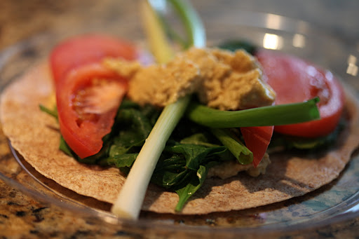 Asparagus, Spinach, Tomato, and Hummus Wrap.